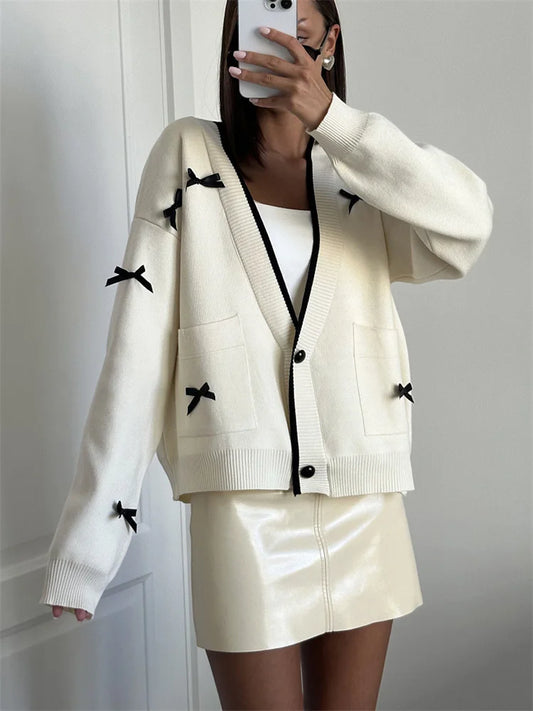 MW | Gestrickter Mantel mit Knopfleiste und verspieltem Katzenprint