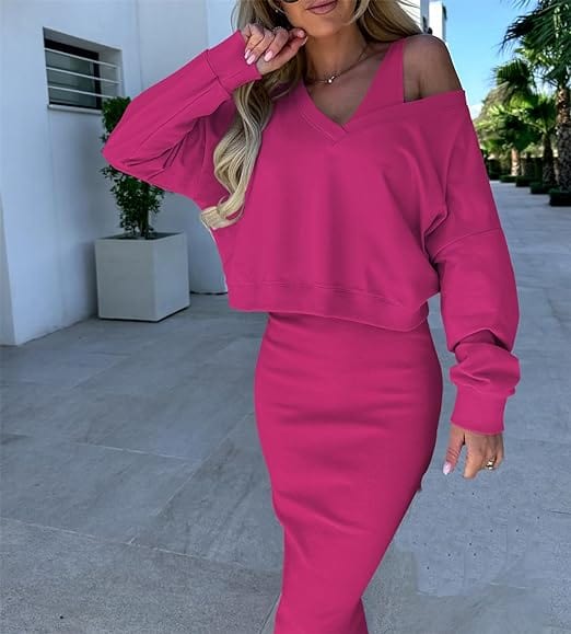 MW | Lockerer V-Ausschnitt Pullover + Gestrickter Wickelrock Set mit schmaler Passform an der Hüfte